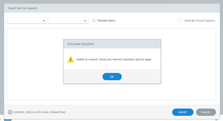 The text to speech tab is not working in articulate storyline 360. The internet connection is stable and working fine still it is showing the below popup. Kindly check and guide me for the same. ...