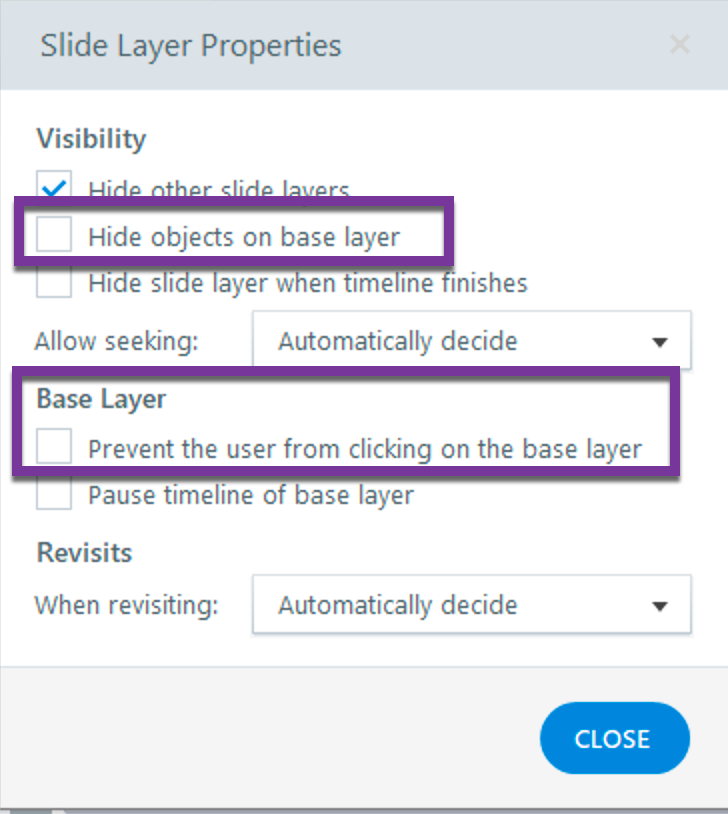 I am trying to give the learner feedback on the base layer (objects changing states like a button from disabled to normal) when they visit all of the layers on my accordian slide. Everything works great (the button state changes and the accordian tabs' state change to visited) when the layers are visited directly from the base layer. But the fun of an accordian slide is that the learner can bop around from layer to layer. How can I set up the triggers to make this work in this situation? Or is a setting on the layers themselves? Thanks for your help!