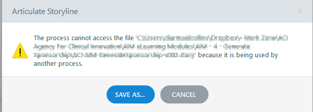 I'm having this error windows when I try to save a project in Storyline 2 Updated 10. It is the same one other users reported before, but I can't see an specific solution for that: "The process cannot access the file 'C:\<name of file>.story' because it is being used by another process."