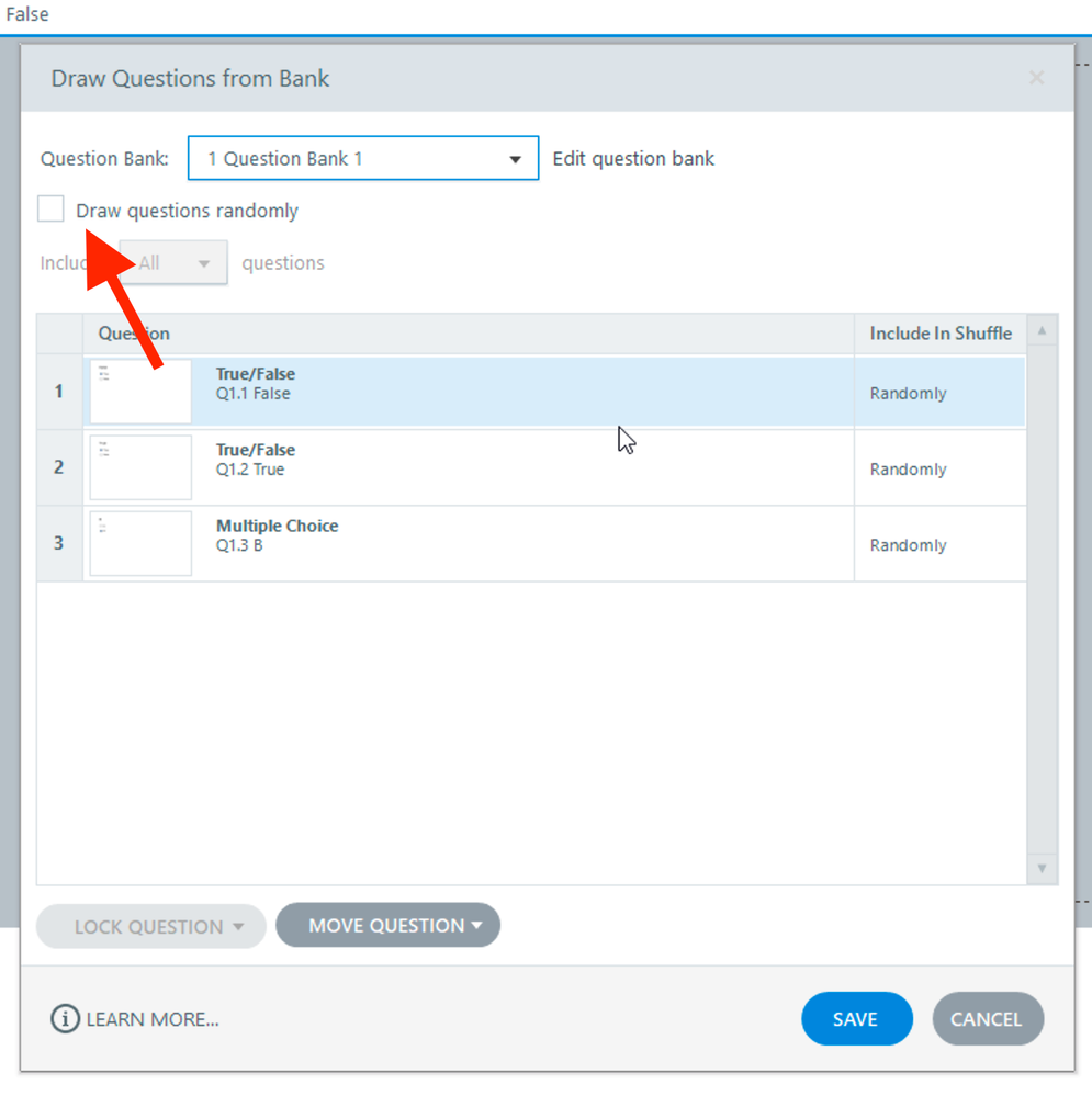 If you do, try disabling this option so Storyline doesn't randomly reassign the order of your questions when your course is previewed. Also, when moving questions to a different position, use the 'Move question' feature that is shown at the bottom of the screenshot to see if this works for you.