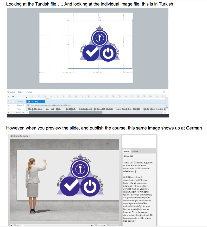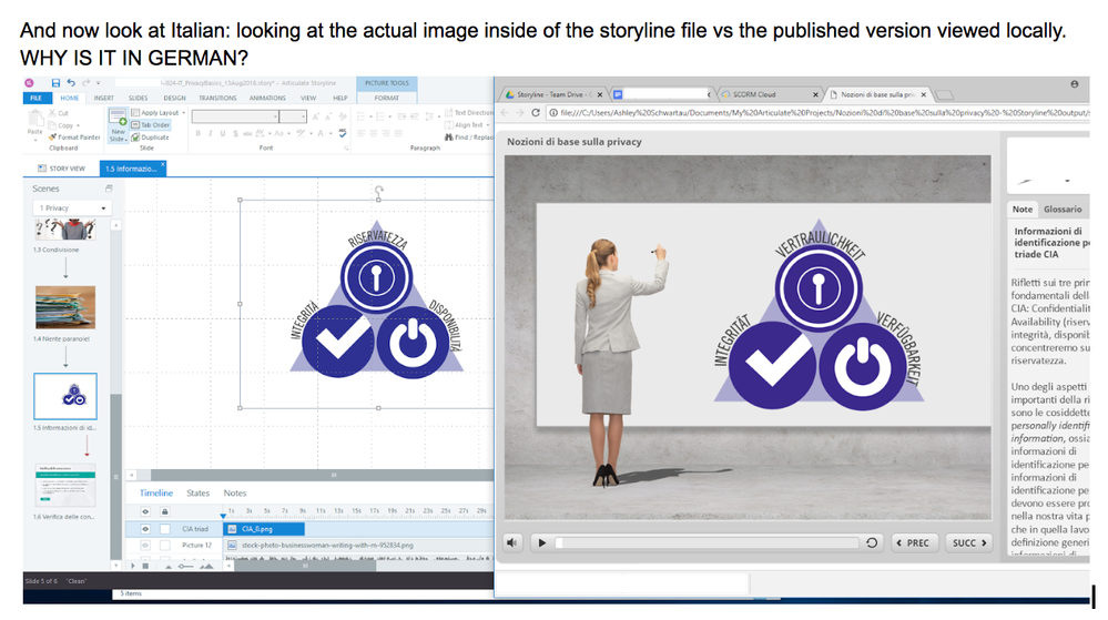When we dig into the Storyline files themselves (thinking our translation company had screwed up and put the wrong images in the wrong language files), we find that the CORRECT image files are in the correct languages. But when we PREVIEW or PUBLISH, that's when sh** hits the fan.