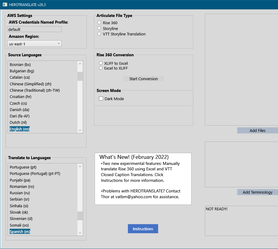 HEROTRANSLATE: Input a .story, .xlf, or .xlff file and it will automatically translate it using AWS Translate. It translates all project text, including the closed captions. You no longer need to deal with the AWS Translate UI at all.