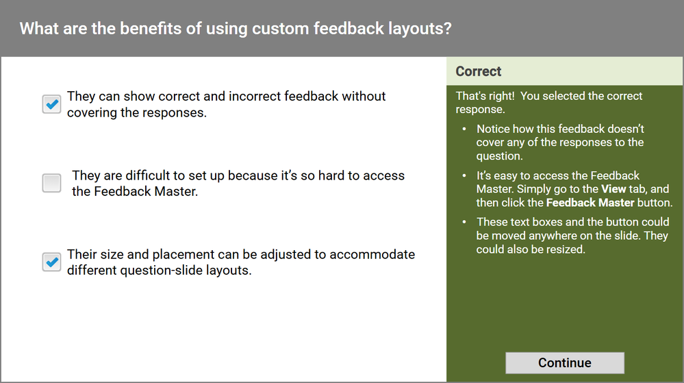 For example, I like to customize the Correct and Incorrect feedback layers for quiz questions so the feedback doesn’t cover the question and responses. The attached Storyline file shows how this method works.