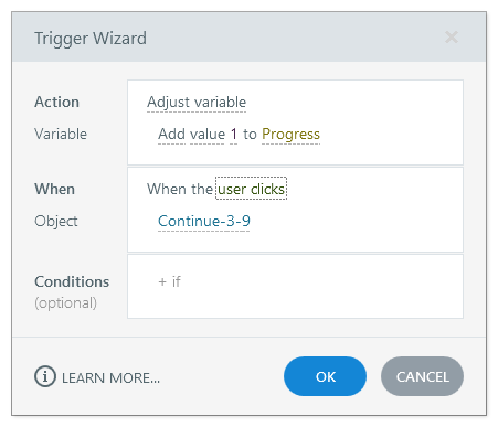 In this image, you can see the Trigger will add the value of 1 to the variable named "Progress" when the user clicks on a button.
