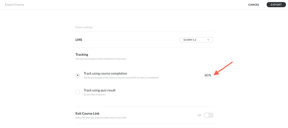 Hey Denise, you can change the completion percentage on the Export page. I hope that helps!