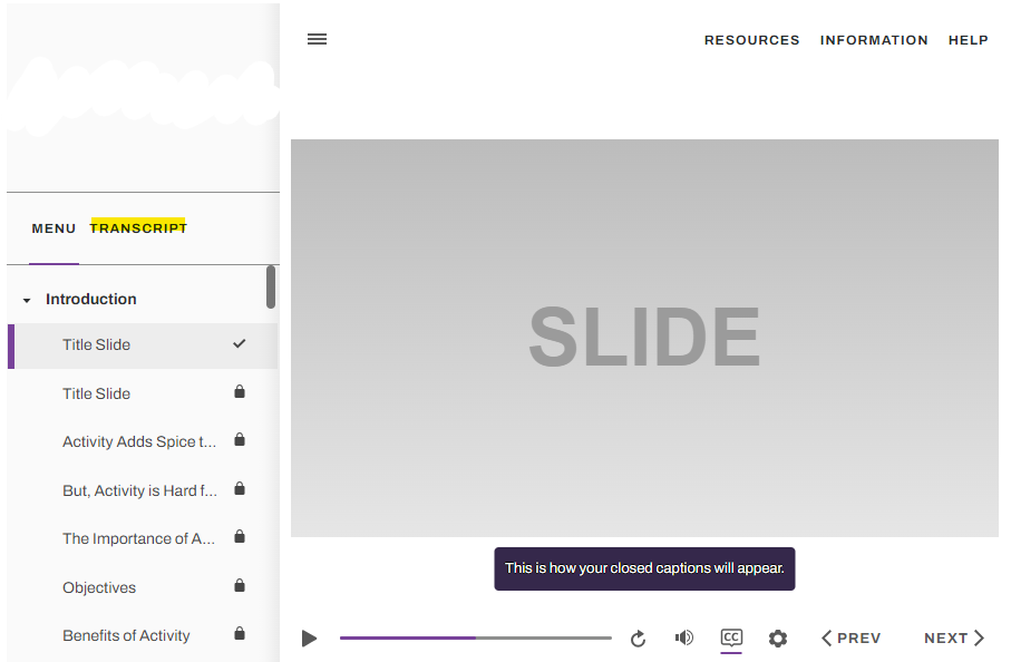I work with a client who includes a transcript for all of their slides. We make this available in the Player by enabling the Transcript button, so the player looks like this: