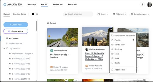 “Yesterday during the webinar about the new features in Articulate, they showed how you can easily translate a course into another language. I sometimes need to translate courses from Swedish to Norwegian. But when I try to do it the way they showed in the webinar, I don’t see the ‘Translate’ button when I click on the three dots on the course (see the pictures). Does it only work in the AI version? We don’t seem to have that feature yet at our company.”
