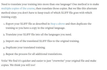 Glad to have found this thread! How long should it take to import the translated XLIFF file? I tried to imort the translated file through Course Settings -> Translations -> Import translated text (step 3). The import was running all night and never resolved. Tried again this morning - same issue. Does this indicate a problem with the file?