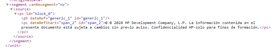 <pc dataRefStart="span_2" id="span_2"> © © 2020 HP Development Company, L.P. La información contenida en el presente documento está sujeta a cambios sin previo aviso. Confidencialidad HP-solo para fines de formación.</pc>(and so on until you get to </target> - it should be a literal mirror except in <source> you would see the original language and <target> would be the translated language.)