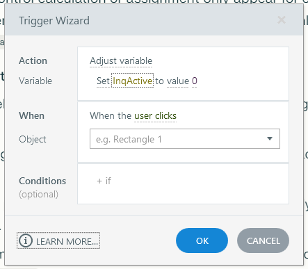 I think what you are looking for can be viewed by clicking the word "Set." This pulls up an option that allows you to perform various functions to the number variable. For example, if you want to add the value "1" to your InqActive every time someone pressed a button, you could choose "Add value 1 to InqActive, when the user clicks (Button)".