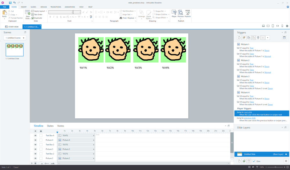 Hi there, Johan. Thanks for sharing your file. I looked and also saw some behavior that felt a bit counterintuitive. Picture 3 wouldn't change the variable when in the down state. When I removed the second trigger, Picture 3 would then change the variable in the down state.