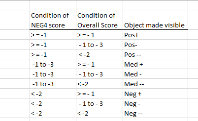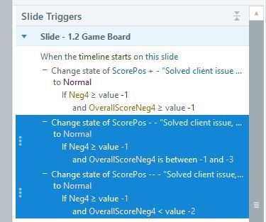 When the timeline of the second slide starts, all triggers are evaluated every time. Those whose conditions are true are executed. When Overall Score is - 3, Pos - will show, then as the system continues through the triggers, it turns out that - 3 is < -2, so Pos -- is shown, covering Pos -. The same is true when NEG4 is -3. Depending on what Overall score is, one of the Med objects will show, then be covered by the corresponding Neg object, because -3 is less than - 2. Changing them to "between - 1 and - 2" might solve that problem.