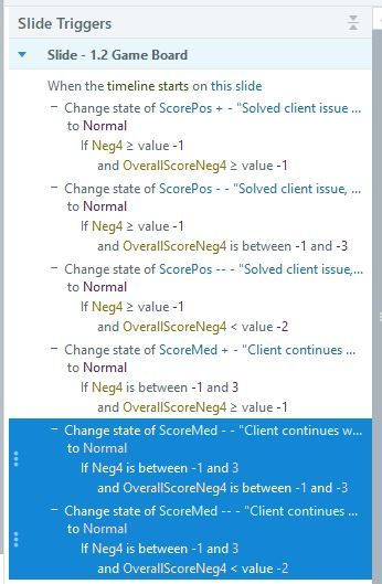 In addition to what Walt has mentioned above, I also noticed that, in some cases, you have conflicting triggers. In the example below, if the OverallScoreNed4 variable is -3, both the highlighted triggers will activate: