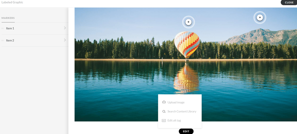 The first one appears to the left of the upper left corner of your graphic when you hover over the Labelled Graphic block and, once this has been clicked, a second one appears below the centre of your graphic, as Wendy has pointed out above. You will not see the pop up until you click on the second Edit button  --  don't ask me why there are two of them !!
