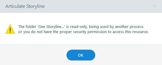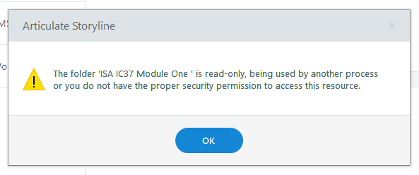 The important note is this: The Storyline error message mentions the folder by name. But it's not showing the name of the selected folder. It's showing the Title in the project.
