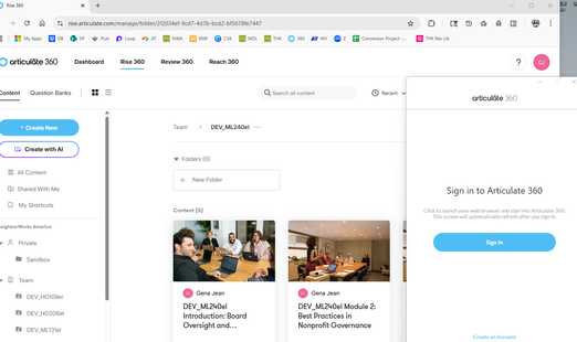 Unfortunately I am still not able to access Articulate Storyline on my computer. I am able to log-in and use Rise - see below. I am logged in online, however still getting prompted to sign in - the sign in to Articulate 360 button loops between Sign In and Start Over when clicked. Please advise.