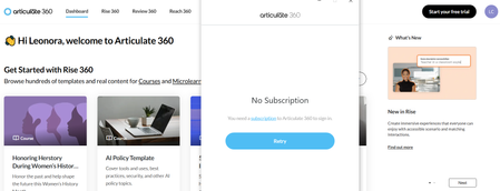 Checking your Articulate ID (e-mail address), I'm not seeing an active trial listed. Can you please confirm you're using the same e-mail address to log in, that was used when you tried to create the free trial? Also, if you follow the prompt to 'Start your free trial' again, are you met with the same result?