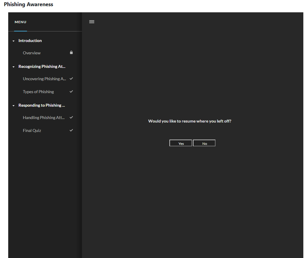 When publishing and uploading SCORM packages created in Articulate Storyline 360, some of my users are encountering an intermittent green "Yes/No" prompt appearing at the start of their course on my LMS. This prompt is not referenced in the project settings (As far as I can see) and seems to occur regardless of the content or structure of the course. It has been observed across multiple projects of mine (but not all), suggesting the issue is not tied to a specific interaction.