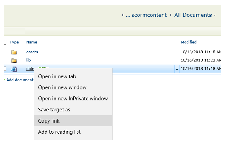 I'm having the same problem too - created a new folder in Documents on Sharepoint site contents. I added the entire unzipped SCORM file, and It won't let me right click to get the code to copy on the index. Even if I change the Index file to .aspx, it changes it back automatically to .html