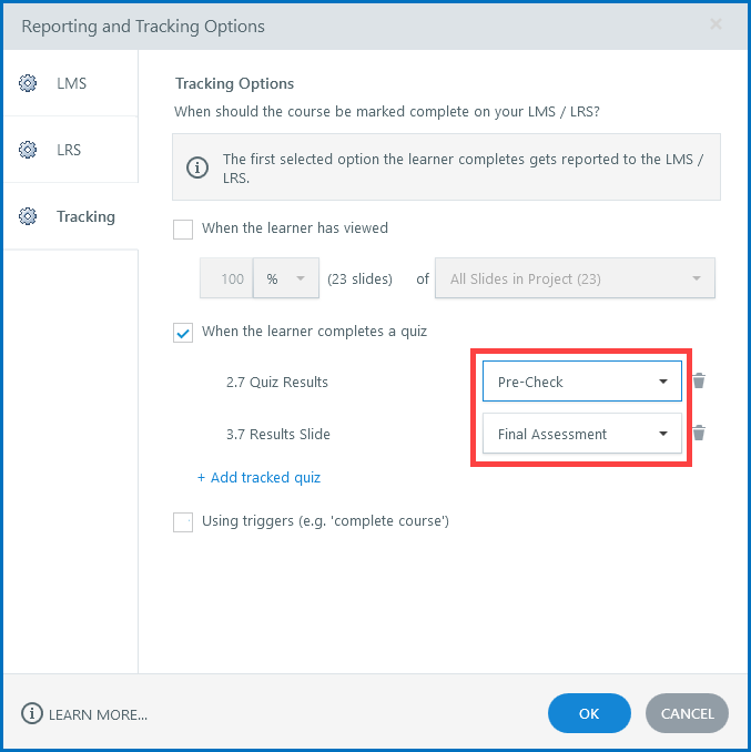 - When publishing the course, indicate that both the Pre-Check and the Final Assessment should be used for tracking.