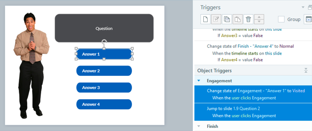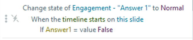 - Set Answer 1 button to "Normal" when the timeline starts if the "Answer 1" variable is False.