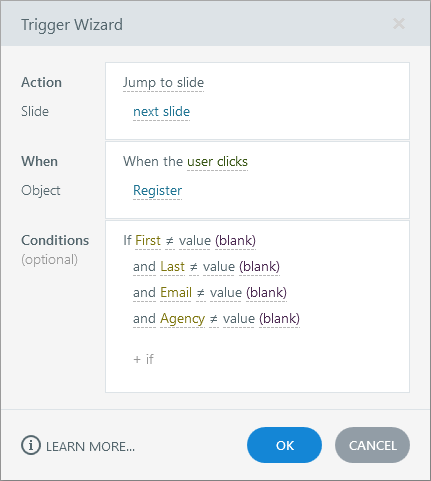 This is my first post and I'm not sure how to put my 'ask' into the right words, but here goes. In Storyline 360, I have a registration form that requires users to input Name, Email, and Agency. I've added conditions to the trigger for the 'Register' button that prevents the user from submitting the form until all fields are complete. This works fine, but users are able to hit the spacebar as an entry and are able to progress by entering a 'space' for each text input. Is there a way to prevent this?