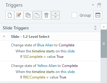 I can get this to work with the blue alien (connected to the variable SSComplete), but not the yellow alien (connected to the variable RKCComplete) and I cannot figure out why. Here are the relevant triggers:
