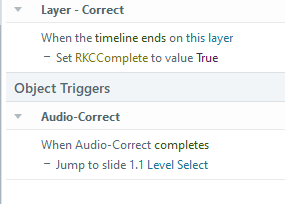 • Wonderful debugging tool: On the selection screen, place a text box with this content: %RKCComplete%   You can find it in the Insert tab, under references. When it plays the reference will be replaced with the contents of the variable, and you can tell if it is changing.