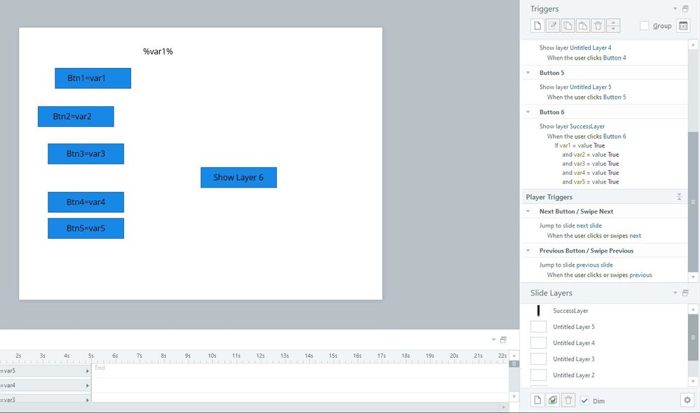 I have a slide with 5 buttons that correlate to 5 layers. The learner needs to click all 5 buttons but they don't have to be in any particular order. The issue I am running into is showing a new layer or next slide based on the 5 layers being visited.