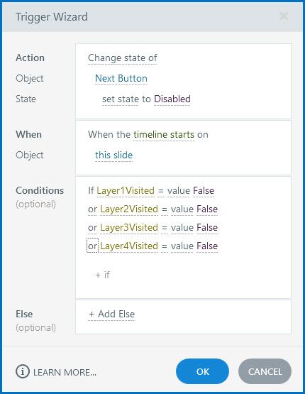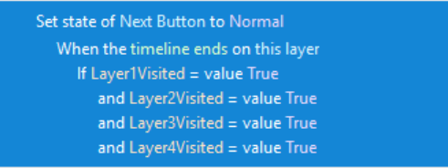 I'm sure this is my error as I rarely use variables. I have a slide that has 4 layers. I need the learner to visit each layer before clicking the next button. I've disabled the next button. I've got 4 True/False variables, one for each layer. They all trigger and change to true once the layer is visited, but the next button never changes from disabled to normal. In the attached I've changed the AND to OR so that you don't need to go through each layer (it's not working with an or statement either.) Any help or suggestions is very appreciated.