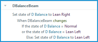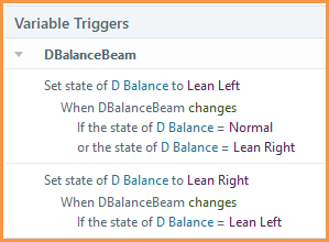 I then have triggers set up to change the state of the balance beam figure to lean right/left and to change whenever the above variable changes.