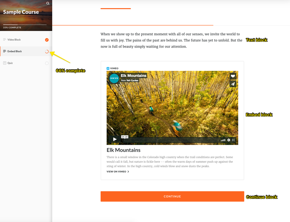 Keep in mind the percentage doesn't depend on the learner watching the video. Even if you were using a Video block, it would still show as 66% complete. The progress indicator updates as the blocks come into view on the screen, even if the learner has not interacted with the blocks.