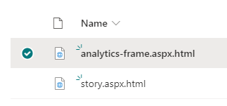 - Rename all the files with a .html extension in your unzipped published output folder to .aspx (keep the same file name). To do this, right-click the file, choose Rename, and then replace .html with .aspx. (Most projects only need to rename the analytics-frame.html and story.html files.