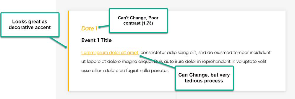 It creates a scenario where we have to be "ok" with the low contrast or change the accent to a darker shade that isn't as good as a decorative accent and may not fit our brand.
