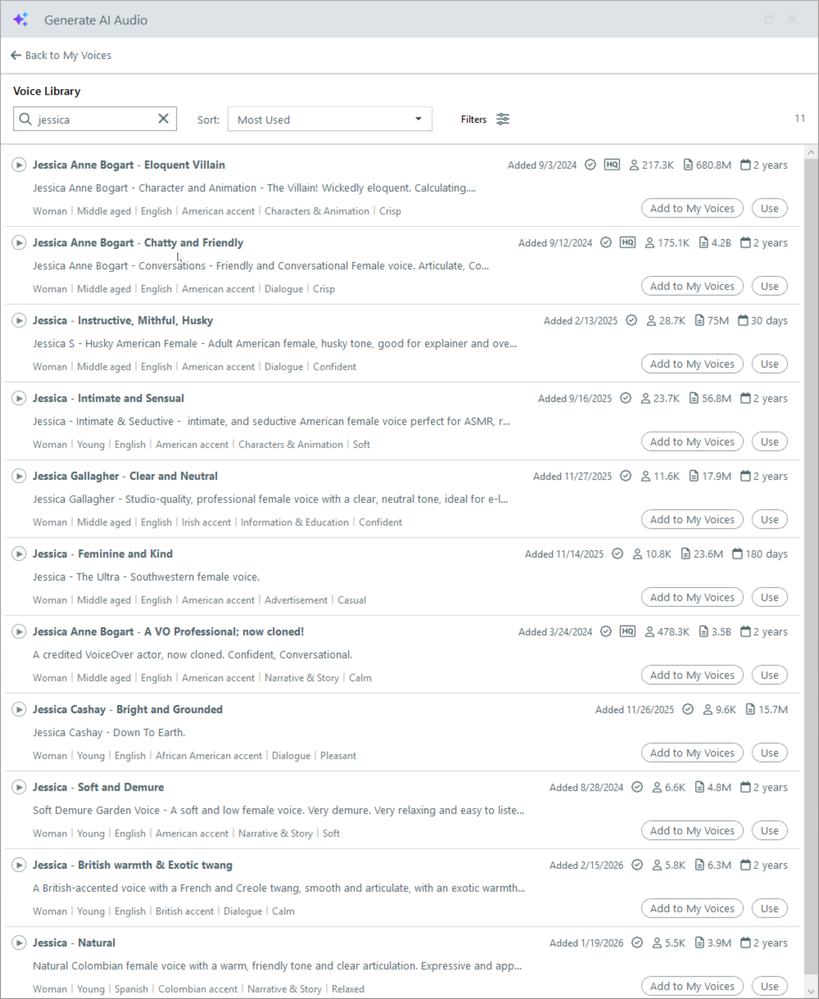 Since we upgraded our Articulate package to include AI, I have used Jessica in many of my projects that are developed in Storyline 360 - including the one that I am currently working on. She is described as young \ english \ American accent \ dialogue \ cute - I love to use her because she sounds upbeat and engaged.