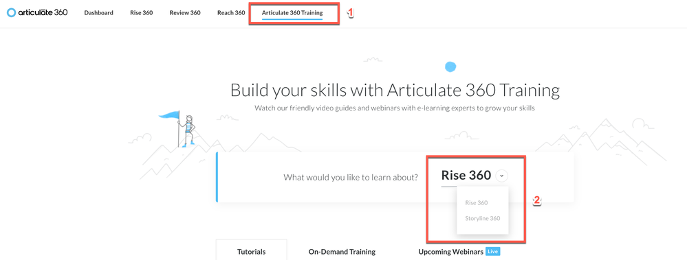 After logging into 360.articulate.com, on-demand training for Rise 360 and Storyline 360 can be found under the Articulate 360 Training tab at the top of the page. From there, the user can toggle between Rise and Storyline from the drop-down menu.