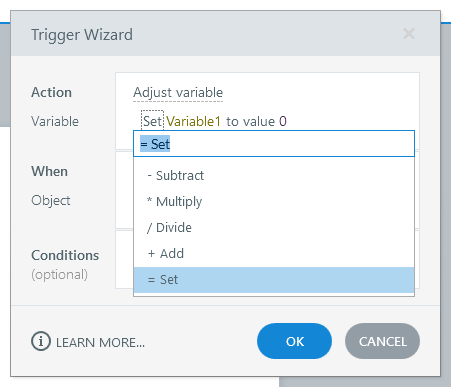 Start with numeric variable, create adjust variable trigger, and click the set part of the trigger. It's on the second line, to the right of the word "variable".