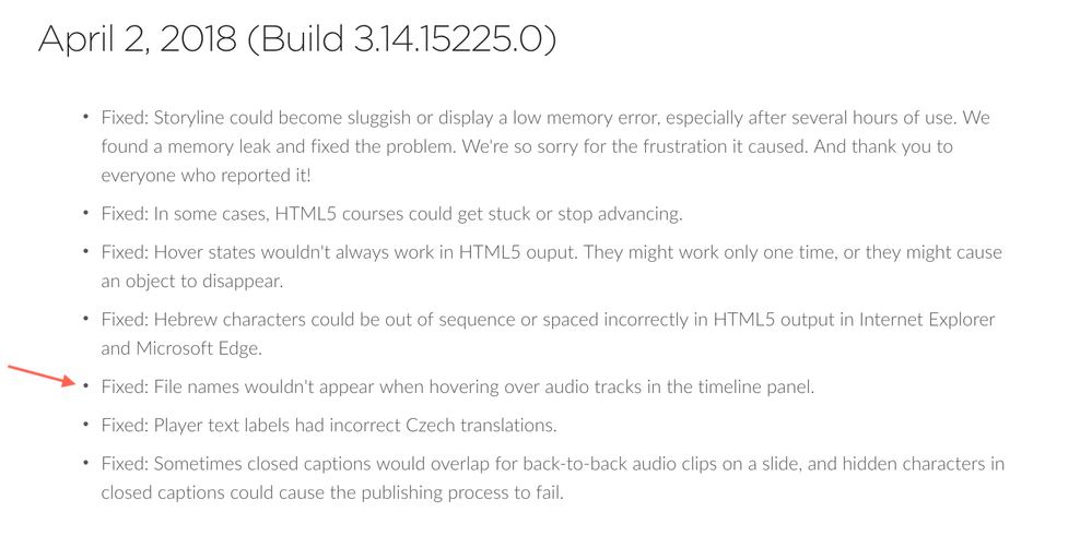 We were seeing an issue in Storyline 360 where the audio file name didn't appear in the timeline, but we fixed that error in update 14.