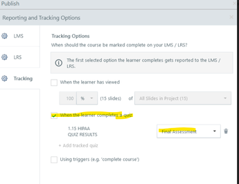 If you want the quiz (lesson) to move to Learning History as Completed even if they failed, then you would also check the Using Triggers (e.g. "complete course"). In Workday Learning, the lesson will say "fail" on the lesson, but the course will say Completed.