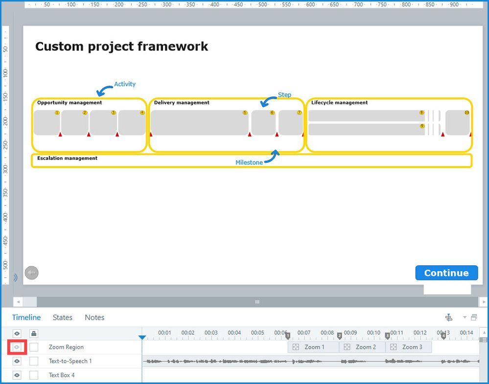 - If you aren't seeing something on the slide that is in the Timeline, chances are the visibility is turned off.