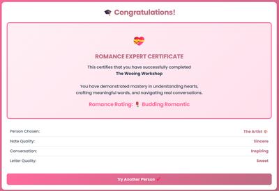 Valentine's Express is an interactive experience where users navigate personality-based scenarios and craft notes and love letters. They choose a personality type, receive personalized feedback, and earn a Romance Expert certificate.