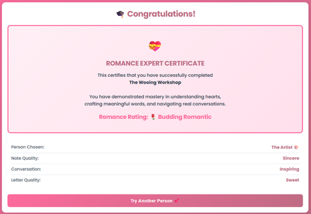 Valentine's Express is an interactive experience where users navigate personality-based scenarios and craft notes and love letters. They choose a personality type, receive personalized feedback, and ...