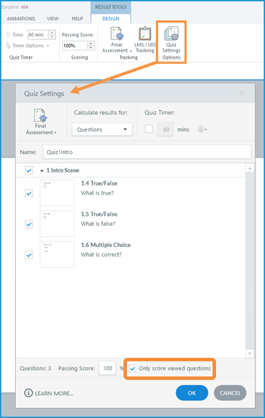 Note that Storyline will base completion on and submit data from the first quiz that the user completes.