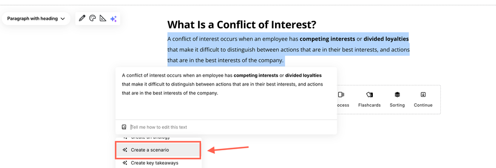 In my experience, scenarios are more engaging for learners than dry policy language. Framing your content around realistic leadership decisions and consequences can make the content actually feel relevant. You can still cover the required material, but you can use examples that match their role and risk level. Even better, you can use the AI Assistant to write those scenarios for you!