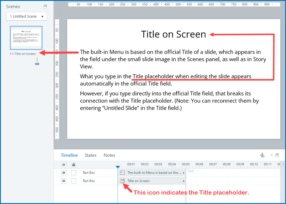Text entered on a slide in a Title placeholder will automatically appear in the Title field in the Scenes panel (which is what Storyline uses in the Menu).