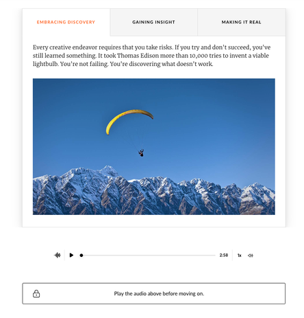 - Add shorter audio clips to individual blocks rather than one long audio clip at the bottom of the lesson. This ensures the learner is listening in-context.