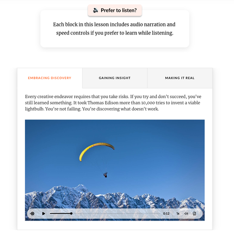 Add a custom block at the top of the lesson or in your introductory lesson to let learners know they can listen to audio narration if they prefer that method of learning. You can even use an 🔊 audio emoji to draw the learner's eye to the message! A couple of tips for this: