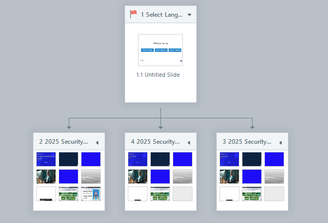 I have to combine two or three separate courses in a single activity (the instance below is one of four multi-language packages) so that learners can select their preferred language in the first scene, then they will jump the corresponding scene (course) for that language which will allow them to complete the activity.