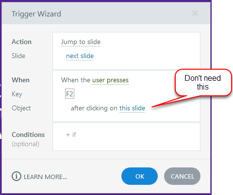 Example: we want the user to click F2 to advance the slide, but the trigger requires a click selection be made that would not be necessary in the actual software.