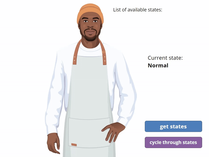 You can use the object().state property to set slide objects to either the "Normal" state or a custom state. When you add characters to the slide, they adopt the Normal state and whatever pose/expression you selected is assigned to that state. Under the States tab, you can edit and add additional states for a slide object. You can select the character state you desire from the list of possible states, and add that to the state list. The names will match the list, so something like "Surprised", or "Disappointed", etc.